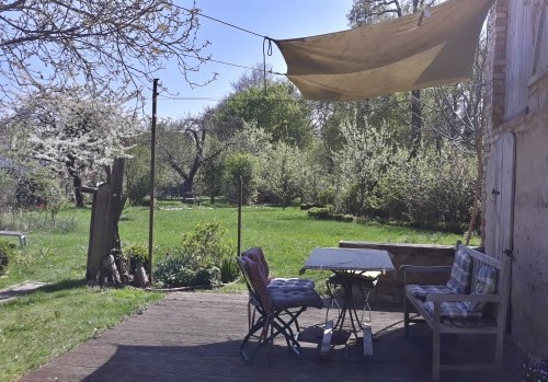 Hinter der Remise liegt ein lang gestreckter Garten mit großer Wiese, Obstbäumen und Staudenbeeten; Mitten drin befindet sich ein kleiner Nutzgarten, der im Juni für Erdbeeren und Erbsen sorgt. Außerdem wachsen im Garten Himbeeren, Brombeeren und Johannisbeeren – etwas ist im Sommer immer gerade reif und lädt ein, im Vorübergehen genascht zu werden.