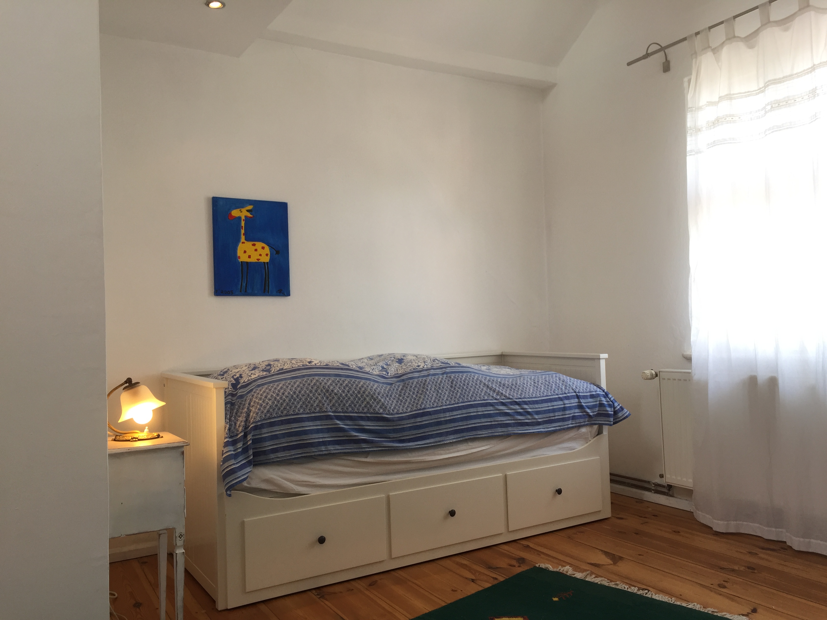 Licht und offen wollten wir unser Haus gestalten und dabei so viel Altes wie möglich erhalten. Einiges haben wir ersetzt oder mit neu hinzugefügten historischen Bauelementen ergänzt. Das Haus gehörte ursprünglich einer Familie, die von der Binnenschifffahrt und dem Obstanbau lebte. Einige Möbel und Gerätschaften blieben aus dieser Zeit erhalten und werden weiter von uns benutzt. Von der Küche öffnet sich eine Terrassentür zu einem geschützten Innenhof mit Sitzplatz. Im Sommer bietet der Walnussbaum am anderen Ende des Hofes Schatten, oder man setzt sich auf die Bank unter dem Kirschbaum im Garten.